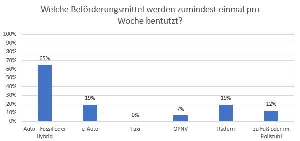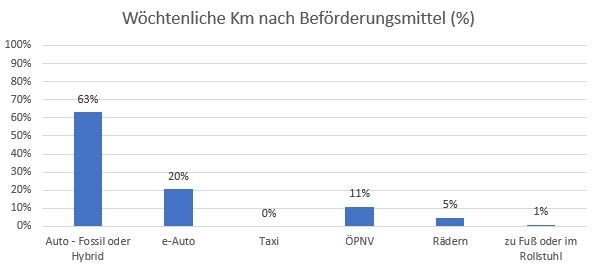 Bei der Berechnung der reinen Zahl an Kilometern ist es wichtig zu berücksichtigen, dass man mit einem Auto deutlich größere Strecken zurücklegen kann, als mit einem Fahrrad. Interessant für uns war, dass fast ein Fünftel (19%) der Teilnehmenden zumindest einmal pro Woche mit einem Fahrrad fährt. Außerdem ist zu berücksichtigen, dass der vergangene Januar und Februar unverhältnismäßig kalt und verschneit war.
